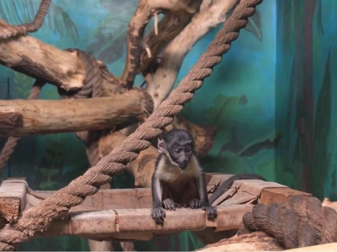 На кадрах видно, как малышка резвится и прыгает в вольере, в то время как ее сородичи обедают. В поисках пищи детеныш случайно ухватился за свой хвост и начал совать его в рот. Однако затем молодая мартышка заприметила настоящую еду у взрослого примата и попыталась выхватить ее. Но осуществить задуманное малышке не удалось.