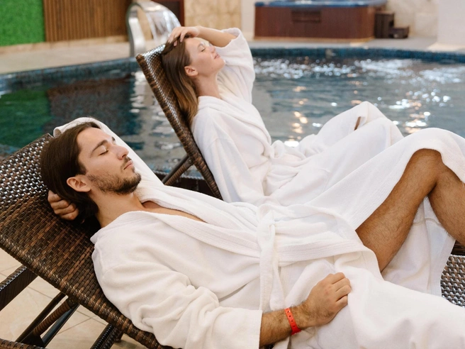 Одно из любимых мест гостей — аквацентр. Здесь есть большой бассейн для свободного плавания с гидромассажной зоной и детский бассейн для самых маленьких. Финская сауна и турецкий хаммам понравятся любителям бани. Затем можно понежиться в джакузи и отдохнуть на шезлонгах вокруг бассейна.