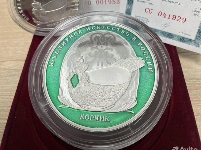 Продавец отмечает, что монета номиналом 25 рублей относится к серии «Ювелирное искусство в России». Изделие весит 155,5 грамма и сделано из серебра 925-й пробы.