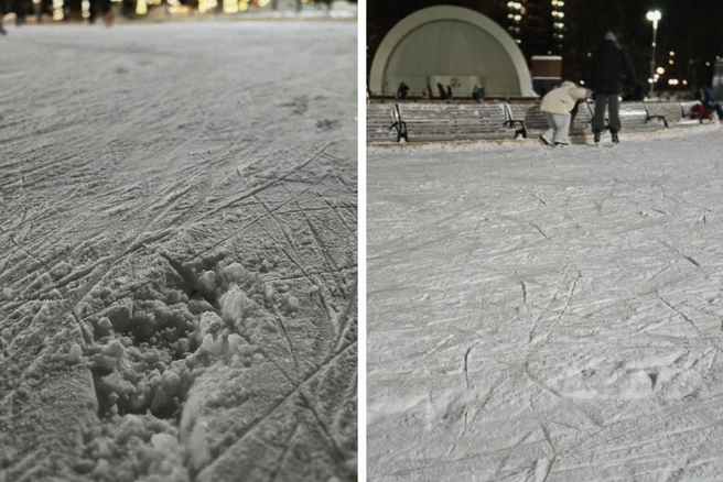 «Каток в Центральном парке залили по мотивам космической вселенной, — возмущена читательница НГС. — Всё в глубоких ямах. Но каток работает, никакого техперерыва. Люди падают на каждой яме».