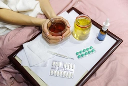 У девушки чай, лекарства, градусник и баночка с анализами. Логично, статья же про болезнь
