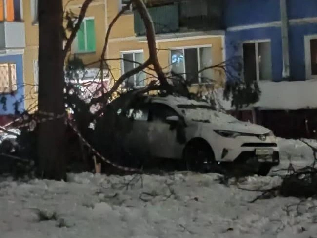 На снимке видно, что автомобиль завален ветками и снегом. Рядом натянута сигнальная лента.