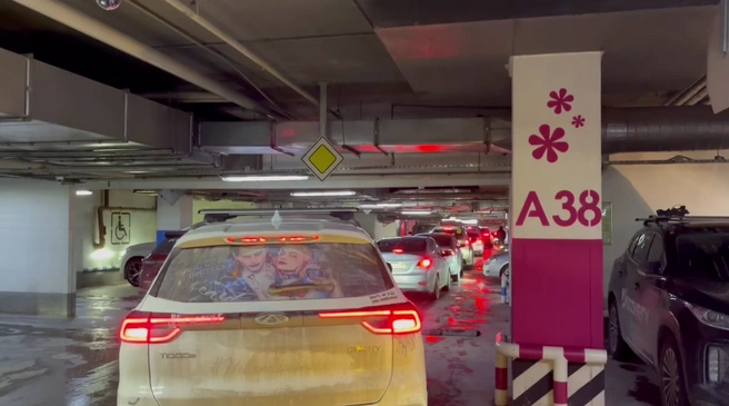 Читатель НГС пожаловался, что на подземной парковке ТРК «Роял Парк» образовался сильный затор. Автомобили стоят в «пробке» с включенными двигателями.