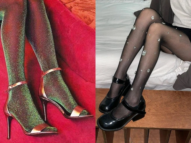 Варианты со стразами, бусинами и ниткой люрекса, которыми также полнятся магазины, хороши для вечернего образа. Акцентные колготки сделают ваш образ наряднее, но учитывайте, что детали привлекают внимание. Обладательницам полных ножек стилисты рекомендуют присмотреться к базовым вариантам, но если очень сильно хочется «ажура», наденьте их с юбкой или платьем длины миди.