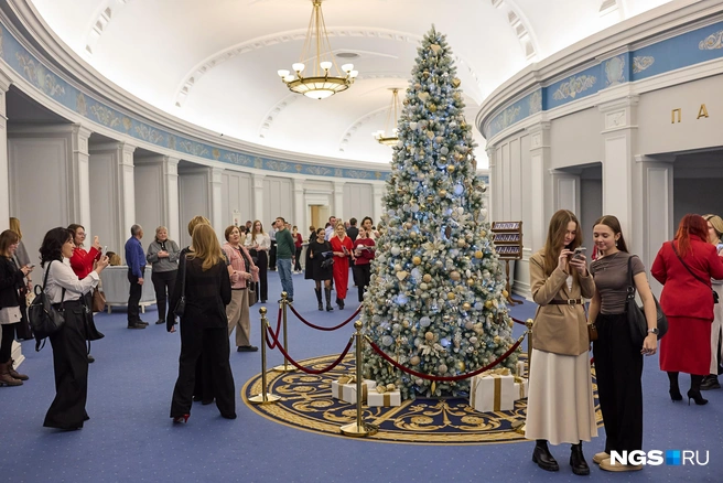 Елка в фойе Оперного театра тоже нарядная, она стала звездой вечера: все стремились сделать с ней фото на память