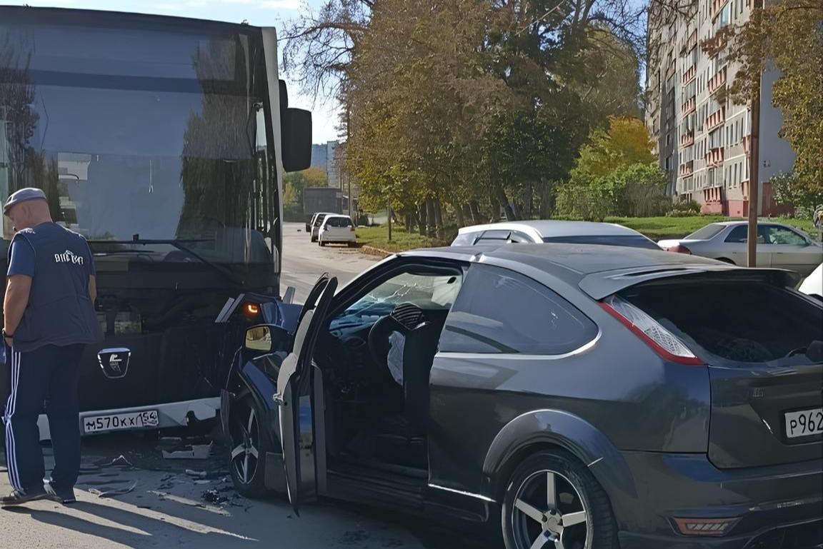 Ford Focus врезался в автобус в Новосибирске — фото искореженной машиныВодитель скрылся с места ДТП