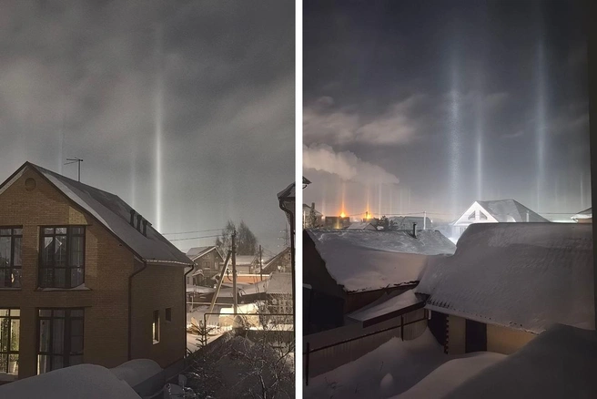 По его словам, такие явления чаще всего появляются в морозную погоду. В это время в воздухе образуются мельчайшие ледяные кристаллы, которые преломляют свет от ярких источников, из-за чего в небе можно увидеть вертикальные световые полосы.