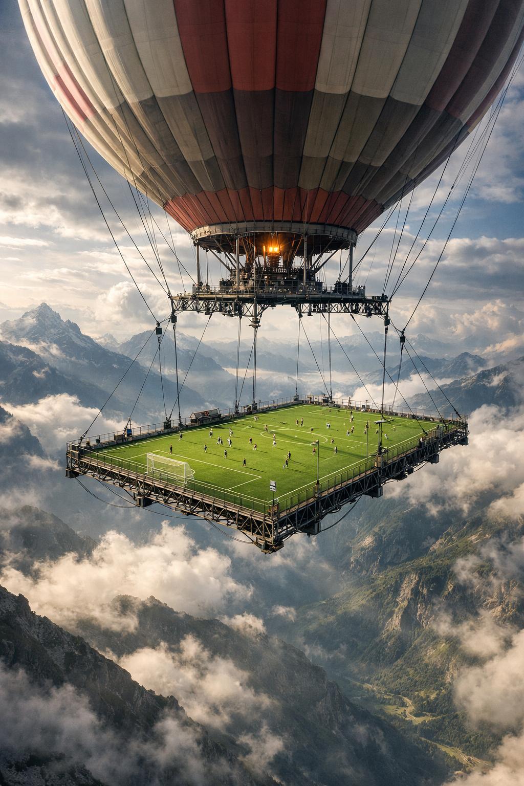 Футболисты в России провели игру на высоте в 1800 метров: гигантское поле подвесили к воздушному шару. С игроками и оборудованием шар поднял в воздух аж 2,5 тонны груза. Конструкцию собирали 700 часов.